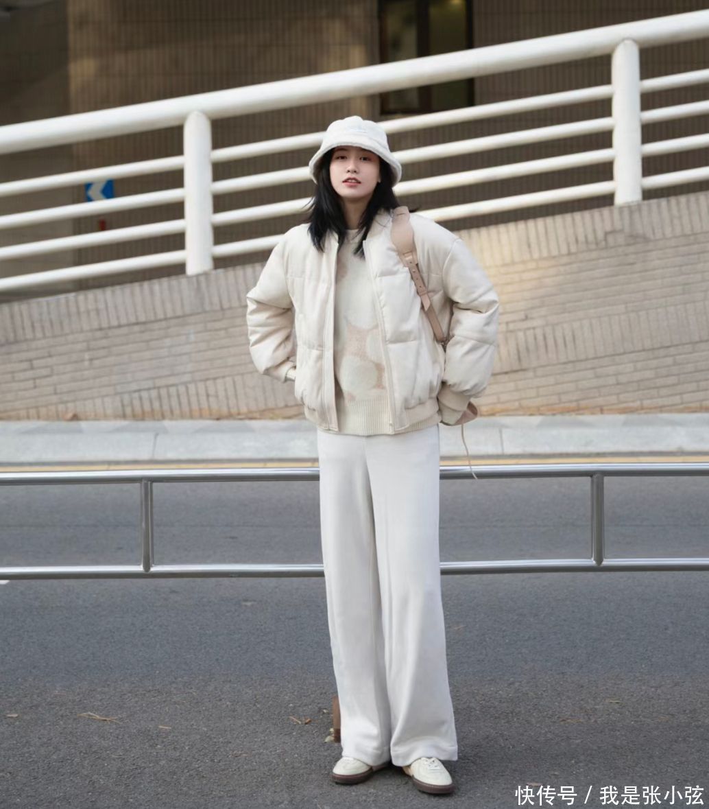 像这种All white的造型,念念要很好的湮灭单调感的话,就一定要选对合适的服装单品。在主导单品的挑选当中,不错尝试一下米白色的短款羽绒服,去更好的提亮咱们的肌肤色泽,再搭配上同色系的高腰阔腿裤,合营感齐备;赞成性单品也不错采用米白色的毛衣,但是要加入一些文静的图案,去解脱单一化。