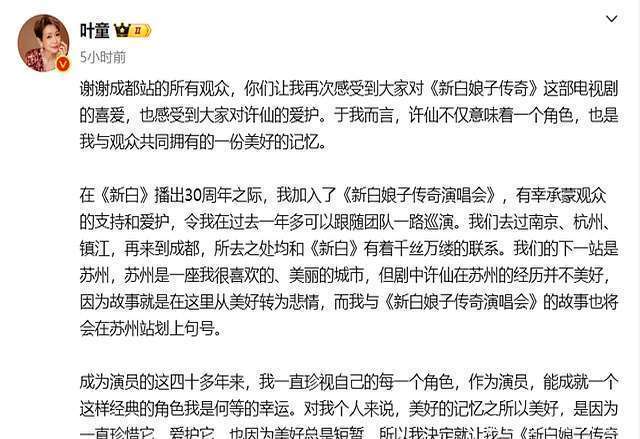 5月25日早晨,叶童在应对平台发文,抒发了对成都站不雅众的感谢,感谢公共对这部剧以及她所饰演的许仙扮装的深爱。她默示,许仙这个扮装不单是是一个绵薄的扮装,更是她与不雅众之间共同领有的好意思好回忆。