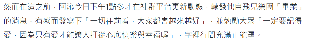 更成心旨真谛的是,花花在被捕前一日还在外交账号上豪情社会事件,嗅觉充满正义感。如今却一会儿曝出藏毒被捕的音讯,让多量网友大跌眼镜。况兼,就在她被捕前一小时,阿沁仿佛没事东说念主一般,他在外交账号上更新动态,转发了他脱离飞儿乐团单飞的音讯,同期感叹称“一切往前看,全球王人会越来越好”,一边还勉励各人内心要充满爱,才气成绩幸福。单从字里行间来看,皇冠集团当时的阿沁可能尚不知情,莫得预判到接下来发生的事情。