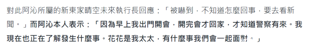 直到该事被曝出,先是阿沁所属的新东家进行了回话,对方暗示很畏惧,但并不了解笃定。随后阿沁本东说念主也进行了回话,他宣称早上出门开会,比及回家才知说念侦察有来。“我当今也正在了解发生什么事。花花是我太太,有什么事咱们会沿途面临。”其实,阿沁的这个回话径直抛清了他我方的关系,同期还修复起好男东说念主的形象,标明他毫不会在重要时分抛下爱妻。